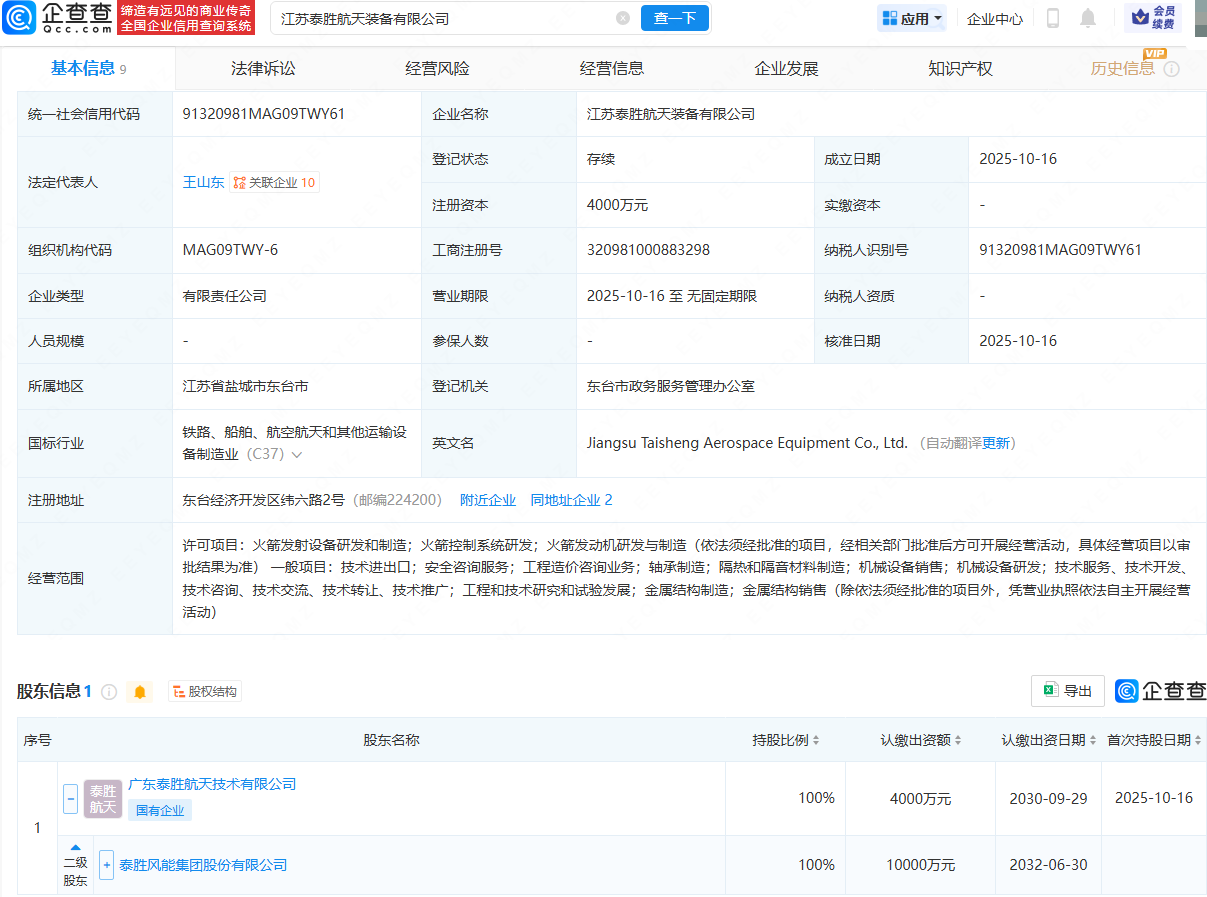 近日,江苏泰胜航天装备有限公司成立,法定代表人为王山东,注册资本为4000万元,经营范围包含:火箭发射设备研发和制造;火箭控制系统研发;火箭发动机研发与制造;轴承制造等。企查查股权穿透显示,该公司由泰胜风能(300129)间接全资持股。